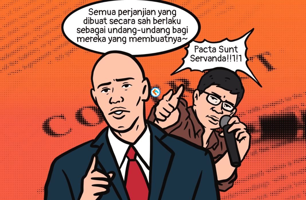 Asas Pacta Sunt Servanda berasal dari bahasa Latin, yang artinya janji harus dipenuhi. Menurut Purwanto, asas ini berarti perjanjian yang dibuat oleh pihak-pihak itu mengikat seperti undang-undang dan pelaksanaan dari perjanjian itu sendiri untuk memastikan kepastian hukum. Asas ini berdasarkan Pasal 1338 Ayat (1) KUHPer yang berbunyi, “Semua perjanjian yang dibuat secara sah berlaku sebagai undang-undang bagi mereka yang membuatnya.”