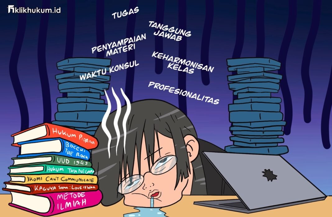 - Tumpukan Tugas dan Tanggung Jawab. Sebagai dosen fakultas hukum, tentu tidak hanya mengajar di kelas. Mereka juga harus mempersiapkan bahan ajar, menyusun soal ujian serta mengevaluasi dan memberikan umpan balik kepada mahasiswa. Belum lagi jika mereka aktif dalam penelitian, membuat karya ilmiah dan menjadi pembimbing skripsi atau tesis. Padahal deadline tetap menghantui, baik untuk menilai tugas mahasiswa maupun menuntaskan karya ilmiah. Jadi, buat kalian yang masih berpikiran kalau dosen itu cuma ‘ngasih tugas dan bikin soal’ duh, coba sini sehari aja jadi dosen.