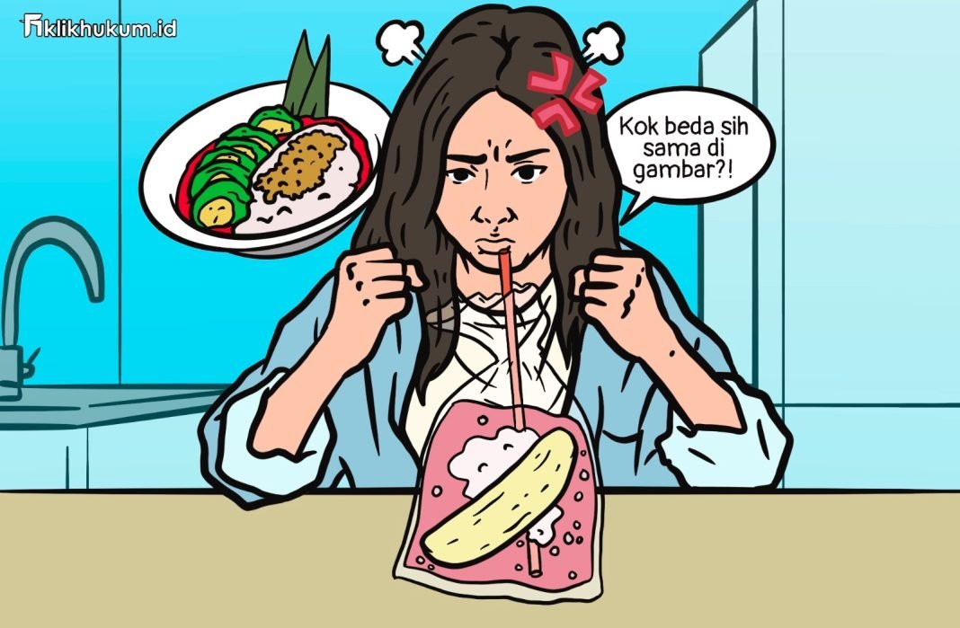 Aku pernah beli es pisang ijo, di gambar es pisang ijonya tuh, dibungkus pake cup, trus pisang ijonya utuh. Lah, pas beli kok, dibungkus pake plastik dan pisang ijonya cuma separo. Aku juga pernah beli pisang goreng topping keju. Nah, di gambar topping kejunya melimpah. Eh, pas sudah jadi toppingnya seiprit. Ih, kesel banget deh! Rasanya pengen cancel beli, tapi nggak bisa soalnya bayar dulu baru dibuatkan pesanannya.